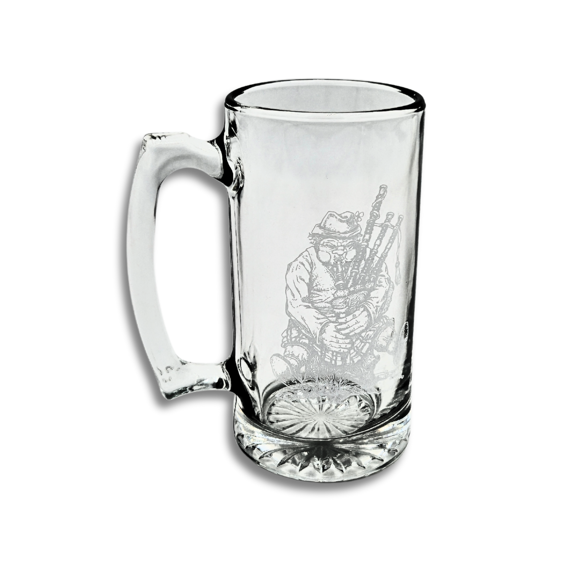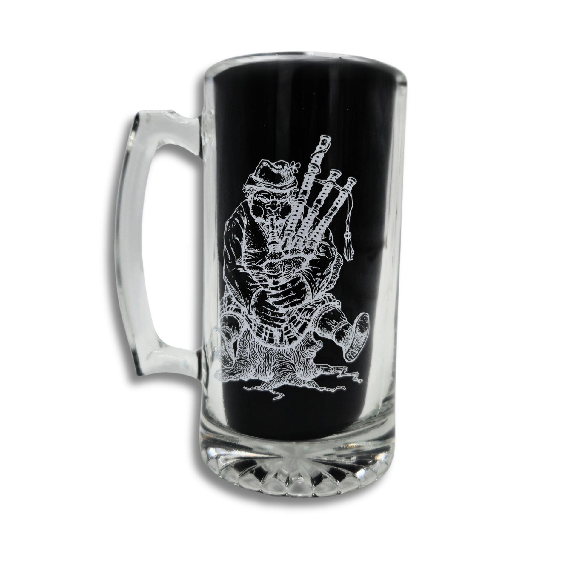 Enjoy a tall one in this hefty 24oz beer mug, featuring our "Grumpy Piper".